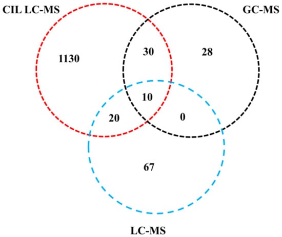 Statistical analyses were performed in Excel and other software. Principal component analysis (PCA) was carried out with correlation matrix by the FactoMineR packages in open-source software language R (version 3.6.3). Partial least-squares discriminant analysis (PLS-DA) was performed by MetaboAnalyst 5.0 (https://www.metaboanalyst.ca/, accessed on 20 March 2021) [12]. Venn diagrams were used to determine the commonly identified metabolites using chemical isotope labeling LC-MS, label-free LC-MS, and GC-MS and visualized by jvenn, an interactive Venn diagram viewer (http://www.bioinformatics.com.cn/static/others/jvenn/index.html, accessed on 20 March 2021 ) [30].