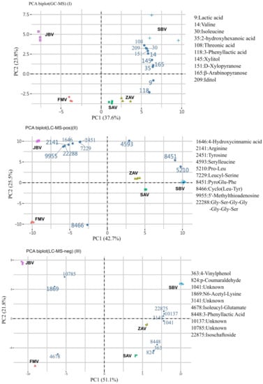 PCA biplots of vinegar metabolites based on non-targeted metabolic analysis.