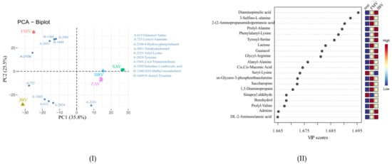 (I) PCA biplot of vinegar metabolites based on chemical isotope labeling LC-MS quantitative metabolomic analysis and (II) VIP score plot from partial least-squares discriminant analysis (PLS-DA) for FMV, JBV, and the rest (ZAV, SAV, and SBV).