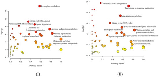 To reveal the main metabolic difference among FMV, JBV (Japan), and the rest (ZAV, SAV, and SBV, all from China), the metabolites identified by CIL LC-MS with high confidence (tier 1 and tier 2) were used as inputs for pathway analyses using MetaboAnalyst (https://www.metaboanalyst.ca/, accessed on 20 March 2021) [12]. As shown in Figure 5, the main difference between Chinese vinegars and Japanese vinegar (Figure 5I, JBV vs. FMV and the rest) was tryptophan metabolism, followed by the citrate cycle (TCA cycle) and lysine degradation, while the main difference between FMV and the rest was aminoacyl-tRNA biosynthesis (Figure 5II).