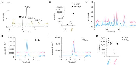 (A) Overlay of electrochemical detection (ECD) chromatograms from extracts of strains UBI4 and UBI5. The peaks corresponding to MK8-11(H2) are marked. (B) Quantification of MK9(H2) and MK10(H2) (MS peak area) in three independent samples of UBI4 and UBI5 cells. (C) Overlay of ECD chromatograms from extracts of strains UBI4-Pd and UBI5-Pd. (D,E) Overlay of SIM chromatograms for CoQ9 (NH4+ adduct m/z = 812.6, D), CoQ10 (NH4+ adduct m/z = 880.7, E). Chromatograms are representative of three independent samples. (F) Quantification of CoQ9 and CoQ10 (MS peak area) in three independent samples of UBI4-Pd and UBI5-Pd cells.
