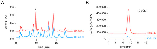 (A) Overlay of ECD chromatograms from extracts of strains UBI4-Pd and UBI6-Rs. * indicates the peak corresponding to CoQ10. (B) Overlay of SIM chromatograms for CoQ10 (NH4+ adduct m/z = 880.7). Chromatograms are representative of three independent samples.