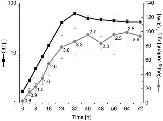 The best strain, UBI6-Rs, was cultivated for a time-resolved analysis of CoQ10 production (Figure 5). The cells grew with a specific growth rate of 0.13 h−1 in the first 24 h and the biomass reached its peak at 32 h with an optical density at 600 nm (OD600) of 62 (15.5 g L−1 CDW). The kinetics of growth and CoQ10 production largely overlapped with the CoQ10 content reaching 95 µg g−1 CDW after 40 h and remaining around that level until the end of cultivation. Notably, the CoQ10/CoQ11 ratio was rather low at the beginning with 0.6 but increased steadily during exponential growth to a maximum of 3.3 at 32 h (Figure 5). The strain UBI6-Rs carries the ddsA gene from P. denitrificans that is expressed constitutively in the ispB locus, and the ddsA gene from R. sphaeroides, expressed from the vector pRG_Duet2 upon induction by isopropyl-β-d-1-thiogalactopyranoside (IPTG) at the beginning of the cultivation. As shown before, expression of ddsA from R. sphaeroides promotes higher CoQ10 production with lower accumulation of CoQ11 than ddsA from P. denitrificans, which explains the low CoQ10/CoQ11 ratio at the beginning and its increase over time.