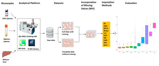To systematically assess the accuracy of 10 imputation methods commonly applied in metabolomics studies, replicates of a commercially available NIST plasma sample, baboon plasma, and liver samples were processed and acquired on a Q-Exactive HRGC Orbitrap-MS in electron ionization (EI) mode. Following data analysis and metabolite identification, raw data were separated into either full data (with missing datapoints for individual metabolites/samples) or complete data without any missing data. Missing values were incorporated into complete or, in some cases, full datasets using various missingness types at different missing proportions and with various coefficients of variation (CV) prior to imputation method evaluations (Figure 1).