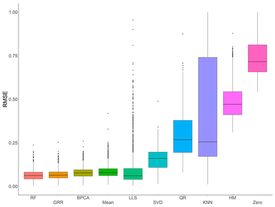 In order to systematically evaluate and assess the performance of various imputation methods using metabolomics data acquired with an HR Orbitrap GC–MS, ten common imputation methods (RF, GRR, BPCA, Mean, LLS, SVD, QR, kNN, HM, and Zero) were initially evaluated for accuracy in the complete NIST plasma dataset with four different missing mechanisms (i.e., MCAR, MAR, MNAR, and MCAR–MAR–MNAR). Evaluation of imputation accuracy with RMSE revealed four methods (RF, GRR, BPCA, and Mean) with comparably low RMSEs (Figure 2). The RMSEs of these methods showed similar patterns across all four missing value types (Figures S1–S4). Further, to evaluate imputation methods on the full NIST plasma dataset (i.e., the entire dataset, including the real missing values), we imputed with Mean, BPCA, GRR, and RF and assessed imputation performance on these technical replicate samples based on correlation and Cronbach’s alpha. Here, we would expect the mean sample-to-sample correlation to be as close to 1 as possible. The Cronbach’s alpha is a measure of internal consistency that is highly related to the overall correlation structure. After imputation, RF, GRR, and BPCA all produced the highest mean sample-to-sample correlations and Cronbach’s alphas. The mean sample-to-sample correlations are listed along with the respective Cronbach’s alpha in parenthesis for each method: RF 0.70 (0.986), GRR 0.70 (0.986), BPCA 0.70 (0.988), Mean 0.67 (0.985).