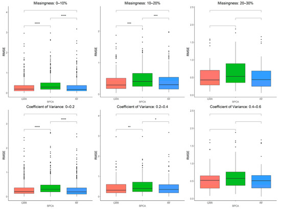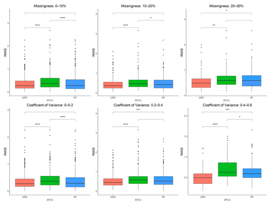 The three most accurate imputation methods (RF, GRR, and BPCA) were subsequently used for imputation of metabolomics data from baboon plasma samples. Using a mixture of all three missingness types (MCAR–MAR–MNAR), we evaluated imputation accuracy based on RMSE at various ranges of missingness and different coefficients of variance (CV) in the complete metabolomics dataset obtained for baboon plasma samples. We found significant increases in accuracy when imputing with GRR over the other two methods for CVs above 0.2 (Figure 3). To assess the correlation between RMSE and CV, we also performed a simple linear regression analysis with the imputation method adjusted as the covariant and revealed a significant association between CV and RMSE (estimate = 1.48, p = 3.9 × 10−13). Similarly, metabolite missingness demonstrated a significant positive association with RMSE (estimate = 0.44, 4.2 × 10−15).