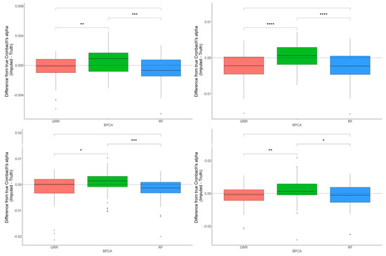 We also compared the Cronbach’s alpha (a measure of internal consistency) between the imputed results and the truth. The Cronbach’s alpha was computed with the complete dataset, and then missing values were introduced and imputation completed. Cronbach’s alpha was again computed on the imputed results and compared with the true Cronbach’s alpha. The difference between the two measures was recorded, and the process was repeated iteratively for global missingness rates of either 10% or 20% and each of the four missingness types. For each method, we computed pairwise Wilcoxon Rank Sum tests to compare each of the methods and a one-sample t-test on the differences between the imputed and true Cronbach’s alphas to test for departure from zero.