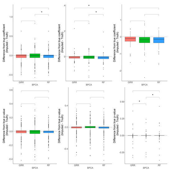 In most scenarios, BPCA was generally the least accurate method. The evaluation of Cronbach’s alpha to assess the differences between the imputed and real baboon plasma metabolomics data revealed that BPCA increased the correlations among the imputed results. Meanwhile, the GRR and random forest imputations decreased the correlations below truth. No significant differences were noted between random forest and GRR (Figure 4). To test for biases in downstream statistical analysis, we estimated the differences between the regression coefficients of the imputed metabolites and the regression coefficients of the complete, original metabolite data. Regression analysis for this study was computed as a function of age, where age was the predictor and the metabolite abundance was the outcome. Pairwise Wilcoxon comparisons of the differences between the true and imputed regression estimates for each method revealed statistically significant differences when applying the random forest imputation method (Figure 4).