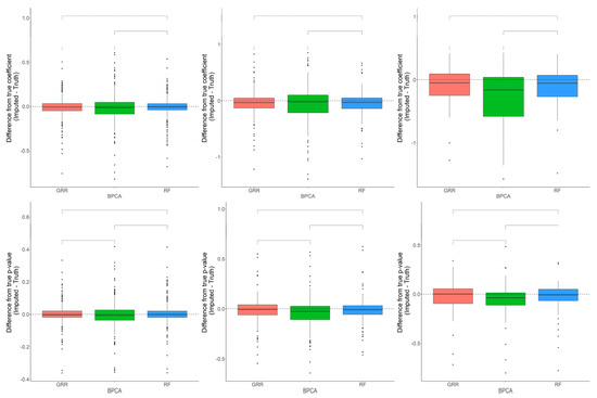 The differences in accuracy between the three methods are marginal, but significant in some cases. Consistent with the baboon plasma metabolomics dataset, the differences between the Cronbach’s alpha computed on the complete dataset, and the imputed liver dataset revealed that BPCA increased the correlation above truth, while GRR and random forest decreased the correlation below truth. No significant differences were noted between random forest and GRR (Figure 7). Pairwise Wilcoxon comparisons revealed no statistically significant differences between methods in their differences between the true and imputed regression estimates. A one-sample t-test to test for departure from zero in the differences between the true and imputed regression estimates showed a small but significant downward bias in the liver dataset, similar to that reported for the plasma dataset (Figure 7). This was true for each of the methods across all of the different types and proportions of missingness (data not shown). In terms of computing the true and imputed p-value differences using a one-sample t-test to test for departure from zero, we reported that only the BPCA method showed a significant downward bias (FDR p = 0.11, 7.3 × 10−9, 0.96 for GRR, BPCA, RF, respectively). Random forest demonstrated the smallest shift in these p-value differences, but all of the methods had mean differences that were slightly below zero (Figure 7).