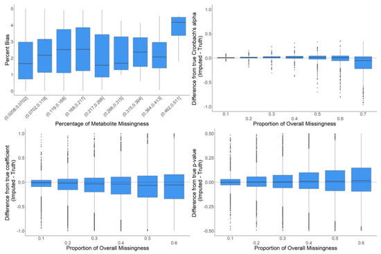 We further examined RF imputation on the full dataset with a wider range of missingness to assess the limits of meaningful imputation of missing data. The goal of these analyses was to observe the behavior of RF imputation on data where the global data structure is as close to reality as possible. To minimize altering the global data structure, we iteratively inserted only a single missing value into the existing data for a particular metabolite where there was previously a real value. The full data were then imputed, but only the difference between the original value and the imputed value at that one data point was recorded along with the information about the metabolite in which the missing data point was introduced (e.g., CV, proportion of already missing values, etc.). These analyses were intended to determine the proportion of missing values in metabolomics data where imputation begins to introduce strong biases or becomes unreasonably inaccurate. The majority of the percentage bias (PB) values were below 5%. However, there was an increase in percentage bias (i.e., decreased accuracy) in metabolites with more than 45% missing data (Figure 8). The evaluation of Cronbach’s alpha showed that at a low proportion of overall missingness, there were small but significant increases in the mean correlations between metabolites when imputing with random forest. However, as missingness increased, this pattern diminished and then actually reversed where the correlations between metabolites decreased when imputing with random forest. We also observed a mean downward bias in the regression coefficients that grew larger as the amount of missingness increased. In addition, we observed that with more missingness, the standard deviation of the differences between the regression coefficients from imputed data and the real values also increased. Finally, there was a slight mean upward bias in the p-values, which grew larger as the amount of overall missingness increased (Figure 8).