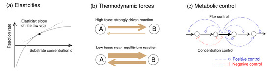 Enzyme kinetics and metabolic control are closely related to thermodynamic forces (Figure 1). In this section, I summarise some important formulae. The metabolic dynamics close to a reference state depend on (unscaled) reaction elasticities, defined as derivatives of kinetic rate laws with respect to metabolite concentrations . Elasticities describe the immediate, local effects of metabolite perturbations on reaction rates: to define them, we formally assume that metabolite concentrations are not dynamic variables, but parameters to be tuned from the outside. At high substrate concentrations, an enzyme becomes saturated and an additional substrate has little effect, so the elasticity is low. Elasticities between rates and other variables, e.g., enzyme levels, are defined accordingly. Importantly, the unscaled elasticities can be rewritten as with unitless scaled elasticities defined as (or ). Scaled elasticities describe effective reaction orders. For irreversible rate laws, we obtain in the enzyme’s linear range and near saturation. If a reaction has two substrate molecules of the same chemical type, we obtain an elasticity . Formulae for second-order elasticities defined, via second derivatives are given in Supplementary Section S2.2. To linearise a metabolic model around a reference state, we only need the stoichiometric matrix and the unscaled elasticity matrix . Both matrices can easily be obtained if the reference concentrations, fluxes, and rate laws are known. A perturbation (e.g., shifting the initial concentrations by a vector ) will lead to a linearised dynamics; by solving the differential equations with the Jacobian matrix , we can simulate the propagation of dynamic perturbations across the network and determine their long-term effects [27]. In models with conserved moieties, a complication arises: the internal stoichiometric matrix has non-full row rank, and we need to use independent metabolite concentrations as the free variables. Their concentrations follow a dynamic equation with Jacobian matrix , and , where and N has full row rank.