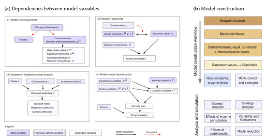 In STM, the mathematical structure of a model is described by a dependence schema (Figure 2a) that lists all independent “basic” variables and the remaining “derived” variables. For brevity, I will use the term “variables” not only for fluxes, metabolite concentrations and enzyme concentrations, but also for kinetic and thermodynamic constants. Following the schema, we can build models systematically step by step (Figure 2b): we start from a network (reaction stoichiometries and regulation arrows), determine the state variables (concentrations, fluxes, equilibrium constants), choose the saturation values, and compute consistent (first- and second-order) elasticities by using Equation (1). The kinetic constants can be reconstructed easily. From the second-order elasticities, we obtain second-order control and response coefficients, describing enzyme synergies for static [23] or periodic perturbations [26]. Any feasible model with the type of rate laws considered can be obtained in this way (for details, see Supplementary Section S2.1).