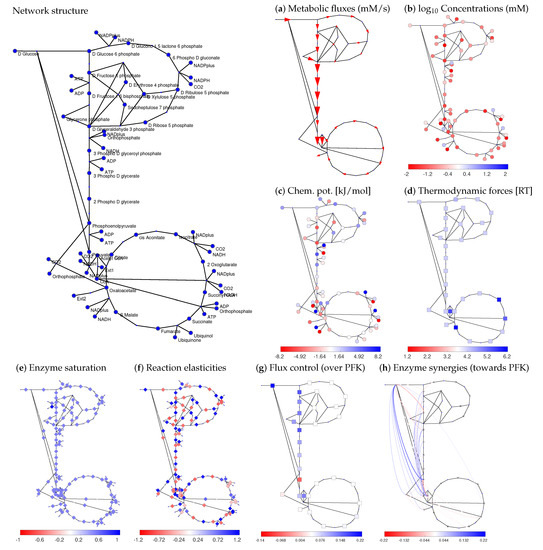 Systematic model construction by STM. Model of central carbon metabolism in Escherichia coli (for model details, see Data Availability). Network structure and flux data (from cells respiring on glucose) were taken from [51]. The panels show different types of variables obtained during model construction following the schema in Figure 2 (circles: metabolites; arrows and squares: reactions). By repeatedly sampling the basic variables and computing the others, a model ensemble can be constructed. (a) Thermodynamically feasible fluxes (red arrows) obtained by flux minimisation (data from [53]); (b) metabolite log-concentrations. Metabolite concentrations and thermodynamic forces were determined by thermodynamic balancing [54] of metabolite and reaction Gibbs free energy data. (c) chemical potentials; (d) thermodynamic forces in units of RT; (e) saturation values, set to standard values of . Alternatively, the saturation values could be determined from data or be sampled at random between 0 and 1; (f) scaled reaction elasticities ; (g) scaled control coefficients for the flux in upper glycolysis (phosphofructokinase reaction) as the target variable; (h) enzyme synergies (given by scaled second-order control coefficients) for the glycolytic flux. Positive values are shown in blue, negative values in red, zero values in white. For clarity, only enzyme synergies in the outer 5 percent quantiles are shown.