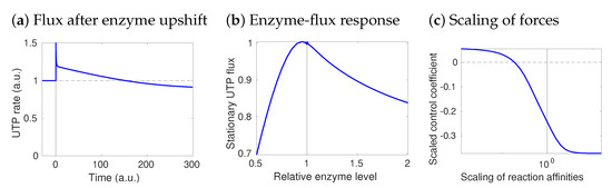 While enzymes can have a negative flux control (e.g., a control over reactions that compete with the enzyme for substrate), it is hard to imagine that they negatively control their own flux. However, there are examples of this. Figure 4a shows results from a variant of our hepatocyte model, but with UTP production during anaerobic growth on glucose. UTP is regenerated from UDP via the phosphotransferase reaction UDP + ATP ↔ UTP + ADP, catalysed by nucleoside diphosphate kinase (NDK). The influence of NDK on its own steady-state flux is described by the flux control coefficient . Surprisingly, in a kinetic model constructed by STM with half-saturated enzymes, this control is negative: a higher enzyme level decreases the flux! This paradoxical effect also shows up in dynamic simulations: when the enzyme level increases, the flux first increases as well, but then drops below the original flux. If we plot the steady-state flux against the enzyme concentration, the slope of the curve—i.e., the response coefficient —is negative in the reference state. Probably, the reason is that UTP production consumes ATP; due to the turbo design of glycolysis [60], a high ATP consumption reduces the ATP level drastically, entailing a decrease in UTP rephosphorylation. In contrast, a lower NDK level allows ATP to recover, and UTP rephosphorylation increases. Is this paradoxical self-inhibition behaviour typical or is it a rare exception, maybe caused by our choice of identical saturation values of ?