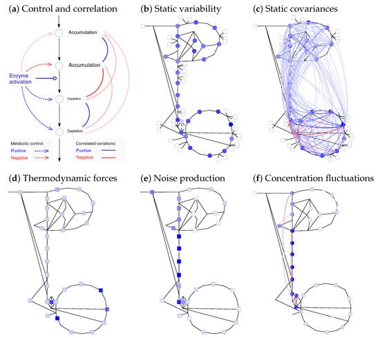 Static changes and dynamic fluctuations of metabolite concentrations. (a) Variability of metabolic states caused by perturbed reaction rates (schematic drawing). An enzyme activation (left) increases a single reaction rate (solid arrow), which changes the steady-state metabolite concentrations and fluxes (dotted arrows). Similarly, variability in enzyme activities (quasi-static random changes) causes slow correlated metabolite variability (curved lines on the right, blue: positive; red: negative); (b) variation of metabolite concentrations in E. coli central metabolism (Figure 3) caused by uncorrelated variable enzyme concentrations (geometric standard deviation of enzyme levels: 2). Standard deviations of log concentrations are shown by colours; (c) correlated metabolite variations (covariances of log concentrations) are shown as coloured lines (values below 10% of the maximal value were removed for clarity). Metabolite variances (in (b)) and covariances (in (c)) computed from first-order response coefficients. Local enzyme fluctuations lead to network-wide metabolite fluctuations: the frequency spectra are related by spectral response coefficients. (d) Thermodynamic forces (same data as in Figure 3d). Effects of chemical noise in a cell volume of 2 m and with a glycolytic flux of 1 mM/min; (e) reactions close to equilibrium (small thermodynamic forces) produce strong chemical noise because of their large forward and backward fluxes. Spectral power density of the original noise; (f) resulting metabolic fluctuations: fast fluctuations at a frequency of 1 s. Formulae are given in Supplementary Section S5.2.