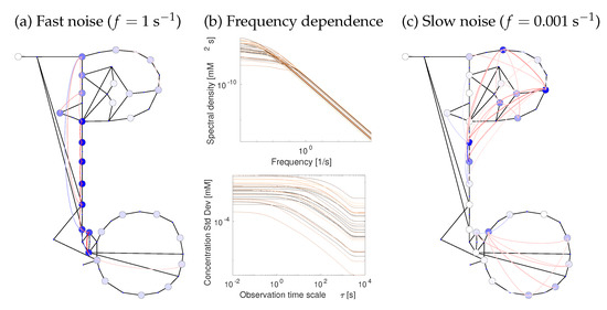 Metabolite fluctuations due to chemical noise. Chemical noise causes random fluctuations of metabolite concentrations and fluxes. In a chemical Langevin equation, chemical noise is modelled by adding white-noise terms to the reaction rates. Fast and slow fluctuations are damped differently in the network. (a) High-frequency metabolite fluctuations (spectral densities at oscillation freuency f = 1 s−1) exist only close to the noise source. Circle colors show the spectral densities at 1 s−1, line colors show covariances (blue: positive; red: negative). (b) Metabolite fluctuations decrease with the frequency (see Figure 6). (Top): spectral densities, each curve corresponds to the variance of one metabolite over a range of frequencies. (Bottom): each curve corresponds to the standard deviation of a metabolite concentration (square root of spectral density, shown on the y-axis), computed for different time resolutions of observation (x-axis). For details, see Supplementary Figure S5a. (c) Low-frequency metabolite fluctuations (oscillation period of 17 min) are correlated along the entire pathway. Results for flux fluctuations are shown in Supplementary Figure S5b. Smoothing at different time resolutions changes the variance of metabolite fluctuations. At low time resolutions, high-frequency fluctuations are filtered out (see Supplementary Figure S5a).