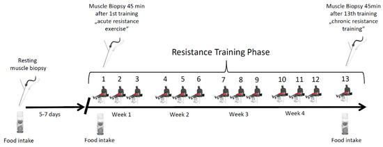 Study protocol. Schematic depiction of the study protocol. Subjects conducted 13 resistance exercise sessions over the time course of the study. Muscle biopsies were taken at rest as well as 45 min after the first and last training session in the fed state.