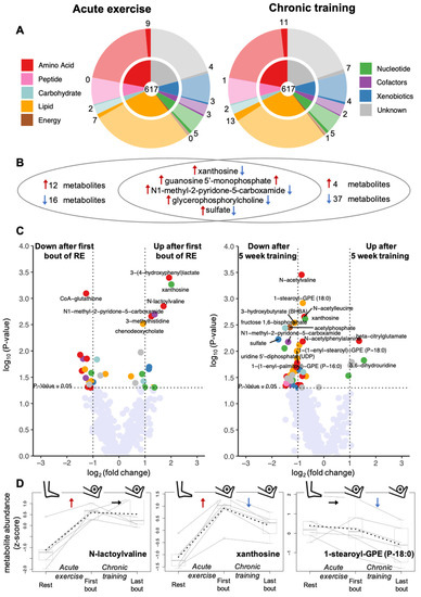 We aimed to identify metabolites that changed their concentration in skeletal muscle in response to acute unaccustomed RE. By using paired t-tests, we compared their intramuscular levels at 45 min after the first bout of resistance exercise with those at rest. We found 17 metabolites that increased after acute RE and 16 metabolites whose levels decreased (p < 0.05) (5 increased after acute and chronic training (Figure 3B intersection)). These 33 metabolites are distributed over 6 out of the 8 metabolite classes covered by our metabolomics approach, indicating a broad metabolic response to a bout of RE that expands significantly beyond energy metabolism (Figure 3 left panels).