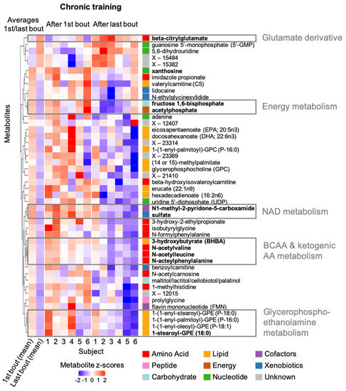 Heatmap of metabolites changing in response to chronic training. Individual and average metabolite levels after the first bout of exercise and after the last bout of exercise following five-week resistance training are shown as z-scores for all 46 metabolites with changes (p < 0.05) in response to chronic training; red color indicates higher levels compared to all levels measured for the specific metabolite in the present study; analogously, blue color indicates lower levels; names of metabolites with significant changes after correcting for multiple testing are shown in bold. Metabolites were clustered by their similarity in metabolite levels at the two conditions across the participants; the resulting clusters are displayed in the dendrogram on the left of the heatmap. Selected clusters and their link to exercise-related molecular processes are highlighted. BCAA: branched chain amino acid; AA: amino acid; NAD: nicotinamide adenine dinucleotide.
