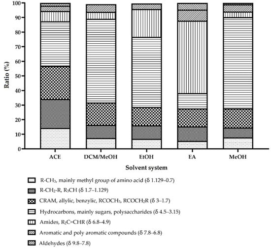 Results revealed that the different solvent extractions resulted in substantial variation in the extracted metabolites. It is well known that the water peak is observed at 4.7 ppm, which is why, in our figure, we excluded the region between δ 4.5 to 4.9 ppm. A figure showing the HDO peak is available as Supplementary Figure (Figure S29). The polysaccharides region showed the highest value at 62.59% using methanol, while ethyl acetate showed the lowest at only 10.38%, and the amino acids regional signals were the highest in the acetone extract at 14.36%. The aromatic portion of the signals was found to be quite similar across all extracts, with the highest value at 7.48% using ethyl acetate and the lowest values at 3.51% using acetone. The aliphatic region, while only making up 6.83% of the methanolic extract, was found to be the richest in the acetone extraction at 19.90%. As for carboxylic and carboxyl-rich alicyclic molecules (CRAM), the extract with highest signals was the acetone extract at 22.53% and the lowest was revealed to be the ethyl acetate extract at 12.48%. Furthermore, the amides region was significantly higher in the ethyl acetate extract compared to other extracts, comprising 49.70% of total extracted metabolites, while the extract with the lowest amides signals was the methanol extract at 3.77%. Aldehyde signals were revealed to be generally low across all extracts, where a negligible number of signals were detected in the ethanol extract and with the ethyl acetate extract spectrum displaying the most intense signals at 4.65%.