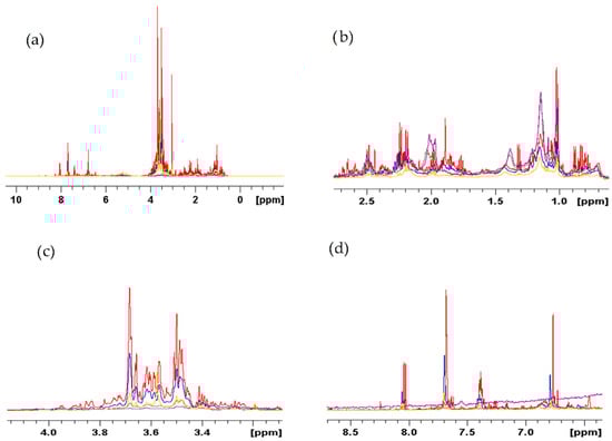 - Emwas, A.H.; Saccenti, E.; Gao, X.; McKay, R.T.; dos Santos, V.A.P.M.; Roy, R.; Wishart, D.S. Recommended strategies for spectral processing and post-processing of 1D 1 H-NMR data of biofluids with a particular focus on urine. Metabolomics 2018, 14, 31. [Google Scholar] [CrossRef]