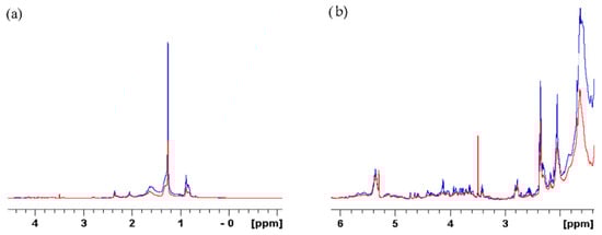 Figure 3a shows a stack plot comparison between two E. foeminea extracts, methanol and ethyl acetate, spectra. The figure demonstrates that more lipids using ethyl acetate were extracted compared to the methanol extract spectrum. Figure 3b shows the extended region from δ 4 to 3.2, this is the typical polysaccharides and sugars region. Due to the region being polar, we see more pronounced resonance peaks from the methanolic extract spectrum, the more polar solvent, compared to the ethyl acetate extract spectrum. Individual typical 1H 1D spectra recorded by 500 MHz liquid-state NMR of each extract dissolved in CDCl3 is displayed in Supplementary Figures S6–S10.