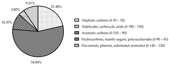Figure 4 shows the 13C spectrum of solid-state NMR. The spectrum can be divided into four main regions, each corresponding to a different class of functional group: aliphatic carbons, polysaccharides and cellulose, aromatic carbons, and carboxylic phenols and carbons. As expected, the polysaccharides region is dominating the spectrum, shown in the mid to high-field region δ 90 to 45 ppm [35,36]. The high-field region from δ 45 to 10 ppm showed peaks mainly associated with aliphatic carbons. The low-field region beyond δ 90 ppm contained mainly aromatic and carboxylic resonances.
