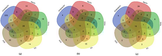Venn diagrams showing overlapping and unique compounds of E. foeminea crude extracts using different solvents analyzed by (a) positive ion mode and (b) negative ion mode LC–MS scans, and (c) GC–MS scan. Ace, acetone; DCM/MeOH, dichloromethane/methanol; EtOH, ethanol; EA, ethyl acetate; MeOH, methanol.