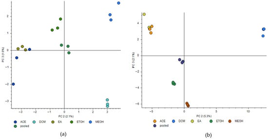 Principal component analysis (PCA) score plots of different solvent E. foeminea crude extract LC–MS data per injection. (a) negative mode scan; (b) positive mode scan. Ace, acetone extract; DCM/MeOH, dichloromethane/methanol extract; EA, ethyl acetate; EtOH, ethanol; MeOH, methanol. Samples were analyzed in triplicates.