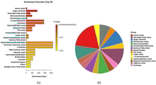 (a) Over Representation Analysis (ORA) Bar chart and (b) pie chart of the chemical classification of the total metabolites identified in the five E. foeminea crude extract samples using GC–MS via metabolite set enrichment analysis (MSEA). Colors in the bar plot describe the p-value. The red and orange colors signify the high and low values, respectively. The lines indicate the enrichment ratio, which was computed by hits/expected, where hits = observed hits and expected = expected hits. The colors in the pie chart designate each chemical group relative to the total number of compounds.