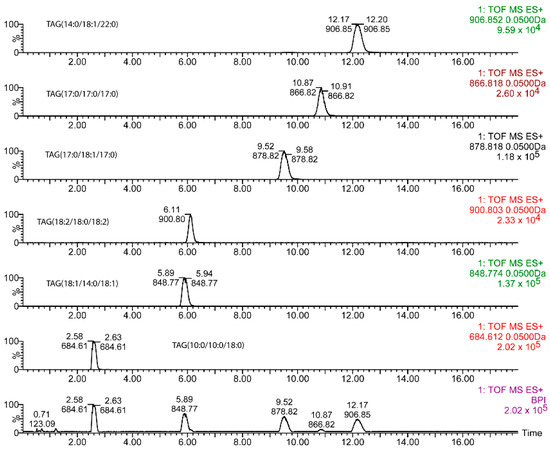 Typical base peak chromatogram (lower panel) and extracted ion chromatograms for the diverse triacylglycerols (TAGs) used in this study. TAG concentration was 10 μg/mL (see Section 4 for mM concentration equivalence).