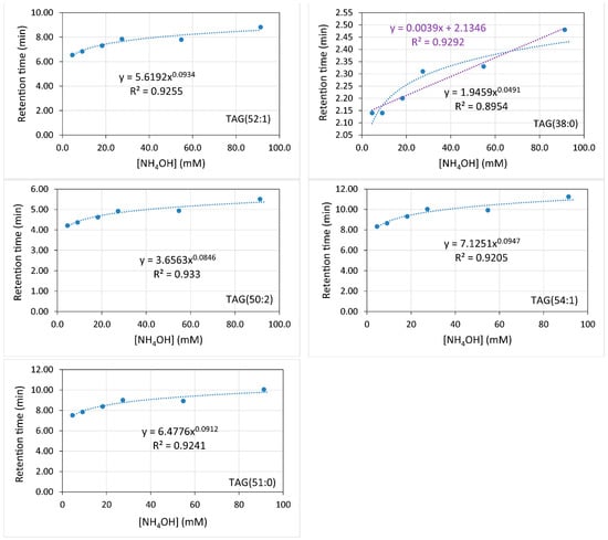 Diverse elution gradients were checked, with run times ranging from 18 to 24 min. Finally, that shown in the Materials and Methods section was chosen as the optimal one for the subject of this study, even though TAGs with more than 60 carbon atoms and fewer unsaturations did not elute within the run time. A typical chromatogram obtained for the standards with the reported method is shown for 54.78 mM NH4OH in Figure 1. For this chromatographic platform, the elution time increased with the ammonium concentration (mM) (Figure 2) according to a power function whose power rose in turn with the chain length, also according to a power function (Y = 4 × 10−5 × X1.97) (data not shown).
