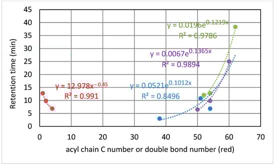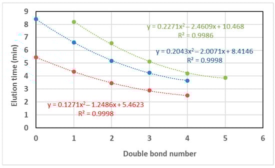 When elution time was plotted against the number of double bonds for diverse TAGs (Figure 10), a quadratic equation was found to fit this correlation, whereas a power equation was found to better fit this correlation for the standards (Figure 3). These contradicting results may be a consequence of using only three points in the standard correlation, and consequently, a quadratic equation could not be fitted. There was agreement between the standards and the ovine plasma TAG species regarding fitting to an exponential equation for the correlation of elution time against the carbon number (Figure 11), with the coefficient of the exponent decreasing as the double bond number increases.