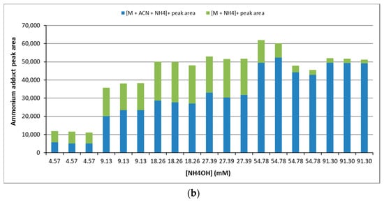Using the elution gradient indicated in Materials and Methods, two adducts were detected in the mass spectrometer, namely [M + NH4]+ and [M + ACN + NH4]+ (where ACN means acetonitrile). [M + 2ACN + NH4]+ was only detectable above 54.78 mM of NH4OH, though with a very low intensity. Similarly, [M + Na]+ was detected with a very low intensity. The highest ammonium hydroxide concentration the highest [M + ACN + NH4]+ adduct formation until achieving a plateau at 76.95 ± 11.67 mM of NH4OH was observed. Conversely, the signal of [M + NH4]+ increased with [NH4OH] until 18.26 mM and decreased beyond this point (Figure 4).
