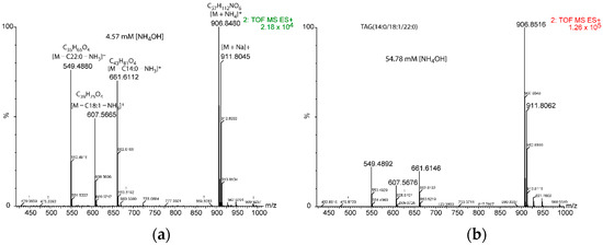 Comparative fragmentation intensity under two ammonium concentrations for TAG(14:0/18:1/22:0). Adducts and elemental compositions are only shown in panel (a) for the sake of clarity. Relative intensity of the [M + NH4]+ adduct was 2.18 × 104 for 4.57 mM [NH4OH] (panel (a)) and 1.26 × 105 for 54.78 mM [NH4OH] (panel (b)).