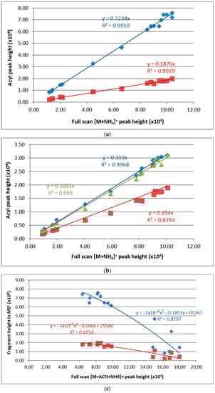 Regarding acyl chains, their neutral loss yielded the carbocation of the dehydroxydiacylgliceride (CnHmO4+). The intensity of the dehydroxydiacylglycerol resulting from the loss of any acyl chain in the MSE spectrum decreased with increasing [NH4OH] (Figure 5). It increased linearly with the signal (peak height or area) of [M + NH4]+ in the full scan with a positive coefficient, but it decreased quadratically with the signal (peak height or area) of [M + ACN + NH4]+. The sn position of the fatty acid did not affect the trends (Figure 6).