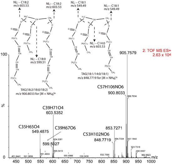 As shown in Table 1, fragments with m/z 599.5 and 603.5 come from TAG(54:4) and fragments with m/z 549.5 and 603.5 come from TAG(50:2). The fragment with m/z 599.5 is rendered after release of a C18:0 acyl chain, which may only be at the sn-2 position since the calculated intensity for the sn-1/sn-3 position is much higher than the measured intensity. For the fragment with m/z 603.5, the intensity rendered by the C18:1 acyl chains in the sn-1/sn-3 position would account for a peak intensity of 11,660.4, and then the contribution of the C14:0 should be low and from the sn-2 position. Accordingly, the most probable TAG compositions are (18:2/18:0/18:2) and (18:1/14:0/18:1) for TAG(54:4) and TAG(50:2), respectively.