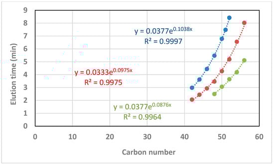 Correlations of elution time (min) against the carbon number for TAGs with 0 double bonds (blue), 2 double bonds (red), and 4 double bonds (green) for 9.13 mM [NH4OH].