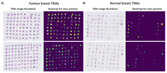 Probability heatmaps of tumour slides (A) and normal slides (B). The output probabilities for class positive predicted by the trained model on the TMA test set were used to reconstruct a heatmap of the full TMA slide. Each tile was represented as a 224 × 224 region within the image, which was then scaled to a thumbnail dimension. The heatmaps in (A,B) display only pixels with probabilities p > 0.5 for cancer prediction.