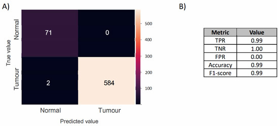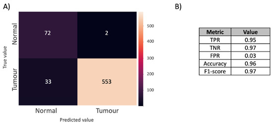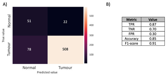 The resultant DL confusion matrix is presented in Figure 2A. The true positive rate, false positive rate, true negative rate, accuracy, and F1-score are reported in Figure 2B. The full results are reported in Table S2, where the metrics introduced in Section 3 are reported after considering thresholds for classifying a core as tumourous in the range between 0 and 5000 pixels. The accuracy and F1-score are, respectively, 0.85 and 0.91. The F1-score is a more appropriate metric to evaluate model performance due to the class imbalance. The true positive and negative rates were, respectively, 0.87 and 0.70, which shows that the model correctly classifies both tumour and normal cores and, at the same time, that it performs slightly better at predicting positive rather than negative cores.