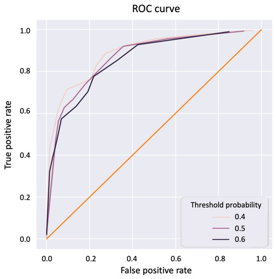 A receiver operating curve - area under curve (ROC-AUC) analysis was performed by placing a threshold of 0.5, 0.4, or 0.6 on the probabilities of a positive prediction, and individual data points are generated by varying the criterion between 0 and 5000 with the number of pixels detected as positive that are necessary to classify a core as tumourous. The ROC curve is presented in Figure 3 with a corresponding AUC of 0.87, 0.85, and 0.70 for thresholds of, respectively, 0.5, 0.4, and 0.6.