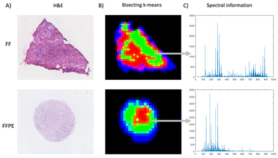 Before comparing the classification performance, it is worth examining the additional dimension of information that MSI provides in the spectral domain. Traditionally, MSI has been most commonly applied on fresh frozen (FF) tissues, as the use of FFPE samples for metabolic research was anticipated to be challenging due to some of the molecular content being lost because of the amount of ethanol gradient to remove water during sample preparation. To evaluate the extent of this effect and hence its impact on predictive modelling, the spectral characteristics of the FFPE MSI dataset used for subsequent classification were first compared to those of a corresponding dataset obtained from comparable FF tissues. To visualise any change in spectral information compared to the more commonly used FF samples, spatio-chemical structures of the FF and FFPE datasets were extracted from similar tumourous areas by using the k-means segmentation approach [29] (Figure 4). After pre-processing, 908 m/z and 158 m/z values were detected in the FF and FFPE samples, respectively, where 26% (41 of 158) of the peaks between FF and FFPE were found to be shared within a tolerance of 10 ppm. By inspection of their respective centroid spectra that correspond to a tumourous region, the FFPE case shows an intensity reduction of features, especially for (phospho)lipids (600–900 m/z), which agrees with previous findings stating that processing FFPE samples with various solvents removes metabolites [5,30]. While not as strong as in FF samples, FFPE samples nevertheless exhibit a fair amount of lipid signals. These results are in line with findings by Hughes et al. [31], who reported that solvent-resistant lipids remained in formalin-fixed tissue. Previous studies have reported up to 72% overlap of metabolites in FF and FFPE samples, but in those cases, analytical platform-matrix-assisted laser desorption/ionisation mass spectrometry imaging (MALDI-MSI) was used [5,32,33]. The ionisation process of MALDI-MSI and DESI-MSI is intrinsically different, and the former involves the use of a matrix, which leads to the formation of matrix ion artefacts, which may pose an additional challenge in FF samples. Specifically, ions from low-molecular-weight metabolites (50–400 m/z) can be suppressed by the abundance of fatty acids and complex lipids, which in the case of MALDI becomes negligible as their signal is overwhelmed by the matrix and matrix fragment peaks. On the other hand, when lipid signals are significantly reduced because of the ethanol gradient during the sample processing of FFPE samples, high levels of low-molecular-weight molecules as well as fatty acids become more prominent in the mass spectrum [34,35,36].