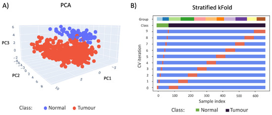 (A) 3D PCA plot (first 3 components) visualisation of normal (blue) and cancer (red) FFPE core MSI data. PC1 = 34.60%, PC2 = 25.97%, and PC3 = 7.90% (B) The cross-validation behaviour is visualised and colour-coded to display the imbalance in distribution. The group colour codes show the number of samples in each TMA. The data was split 10 times, and the samples chosen for training (blue) and testing (orange) are clearly indicated for each iteration of CV.