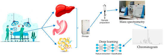 A schematic model of how tissue retrieved during bariatric metabolic surgery can be used for metabolomic analysis, and consequently, the resulting data undergo feature extraction and classification with deep learning techniques. As a first step, metabolomics analyses on tissue samples could be compared against metabolomic analyses on body fluids before operation (serum, urine, feces). At a following stage, fluctuations in metabolite concentrations in body fluids could be measured at standardized intervals after the bariatric operation and compared to both preoperative body fluid values, as well as tissue sample values. At a final stage, changes in metabolite concentrations could be correlated with clinical data that are routinely collected before and after bariatric surgery, such as BMI, blood glucose, HbA1c, HDL, LDL, total cholesterol, and triglycerides, etc.