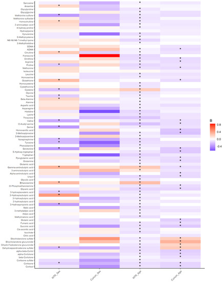 Associations of sex and age with metabolites in the NTR and LUMC-Curium ACTION cohorts. The vertical axis lists the metabolites, and the horizontal axis depicts the associations for sex or age in the discovery NTR-ACTION cohort (NTR) and the replication LUM-Curium ACTION cohort (Curium). All associations marked with a star (*) where significant after correcting for multiple testing (see Section 4). The color gradient indicates the strength of the associations (beta coefficient [B]), where dark blue indicates strong negative associations and dark red indicates strong positive associations. All association results from the discovery are reported in Table S1 and all association results from the replication are reported in Table S2.