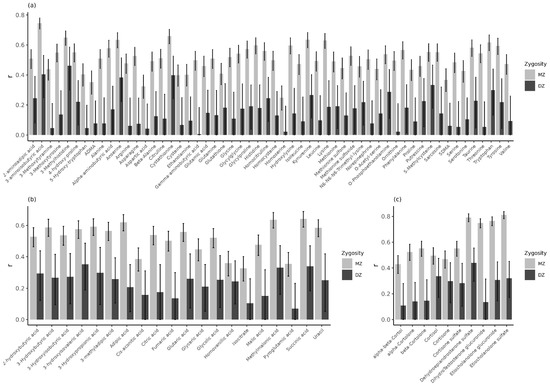 To estimate the lower bound of reliability of the urinary metabolites in children, as obtained with the metabolomics platforms for the ACTION Biomarker Study, we obtained MZ twin correlations for 1068 MZ twins (531 pairs, M age = 9.6, SD age = 1.9, 47.4% females) (Table 1). The MZ correlations, corrected for sex and age effects (Table S3), were on average 0.51 for the amines (range: 0.25–0.75), 0.52 (range: 0.33–0.64) for the organic acids, and 0.61 (range: 0.43–0.81) for the steroids (Figure 2, Table S4). MZ correlations may be interpreted as a form of test–retest reliability [36], and these results thus suggest that approximately 90% of the measures of urinary metabolites in the ACTION Biomarker Study were measured with adequate reliability. In total, 1 (1.8%) amine and 4 (40.0%) steroids were obtained with excellent reliability (rMZ ≥ 0.75), 8 (14.3%) amines and 3 (15.0%) organic acids had good reliability (rMZ 0.60–0.74), and 43 (76.8%) amines, 13 (65.0%) organic acids, and 6 (60.0%) steroids had moderate reliability (rMZ 0.40–0.59) [37]. For the remaining 4 amines (7.1%) and 4 organic acids (20%, rMZ < 0.40), we could not infer their reliability, as low MZ correlations do not necessarily imply low reliability [36].