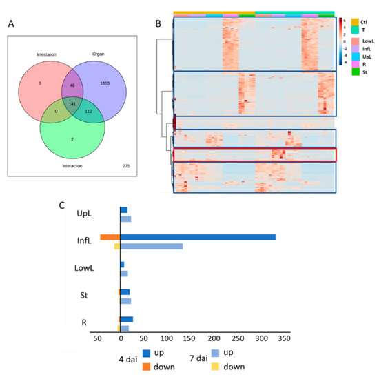Impact of the T. absoluta herbivory on the metabolome of tomato vegetative organs. (A) Venn diagram representing the number of features significantly affected by the organ nature, T. absoluta infestation and their interaction after 4 days of herbivory, determined by a two-way ANOVA (p < 0.05). (B) Heatmap plot and hierarchical clustering based on the feature intensities from the five vegetative parts of tomato plant submitted or not to T. absoluta herbivory for 4 days. Blue squares represent different clusters related to the organ nature. The red square represents the cluster of features affected by T. absoluta herbivory. (C) Number of differentially accumulated features per organ and per duration of herbivory by considering a log2 Fold Change > 1 and p < 0.05 (one-way ANOVA Tukey post-hoc test). The abbreviations for the organ are the following: Infested leaves (InfL), upper leaves (UpL), lower leaves (LowL), stem (St) and roots (R).