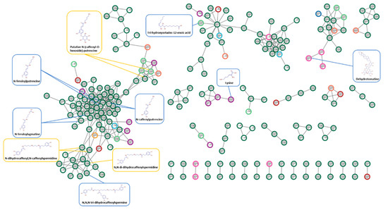 Molecular network of up- and down-regulated features in the tomato organs in response to T. absoluta herbivory. The molecular network was obtained using Compound Discoverer 3.3 and was visualized with Cytoscape 3.9.1 following the procedure described at https://github.com/Florent-1/Molecular-Networks-from-Compound-Discoverer-to-Cytoscape (accessed on 10 April 2022). The pie chart in each node represent the relative abundance of the feature in T.absoluta treated (grey) vs. control (white). These abundances are presented in priority in InfLat 4 days of herbivory, identified by a dark green circle surrounding the node. When the feature is not affected in InfL, the relative abundance is represented for the most impacted organ, with the following nomenclature: Light green, InfL at 7 days; purple: St at 4 days; pink, St at 7 days; dark blue, LowL at 4 days; light blue, LowL at 7 days; red, R at 4 days; orange, R at 7 days. The structures of some formally identified nodes are surrounded in blue, and those of putative compounds are surrounded in yellow.