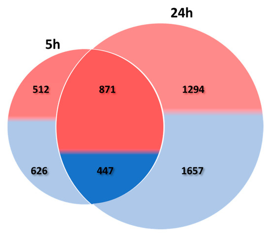 Venn diagram representing the DEGs in tomato leaf after 5 h and 24 h herbivory. The proportion of up- and down-regulated DEGs is shown by the proportion of pink/red and blue respectively. The number of up- and down-regulated DEGs is also indicated. The left circle represents DEGs after 5 h, the right circle, DEGs after 24 h, and the intersection between the two circles the DEGs common to 5 h and 24 h of herbivory.