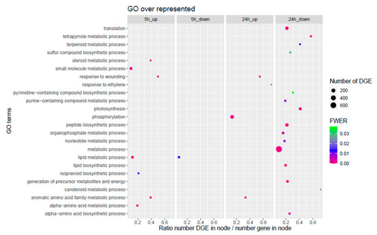 Gene ontology (GO) terms enrichment at p < 0.05 for up- and down-regulated genes after 5 h and 24 h of herbivory. The size of the circles represents the number of differentially expressed genes (DEG) in each GO category. The position of the circles represents the ratio between the number of DEGs in the GO category to the total number of genes associated to the GO category. The color of the circles represents the statistical significance.